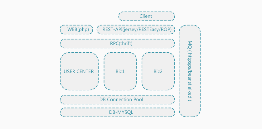 系統(tǒng)采用開放式API平臺(tái),客戶端應(yīng)用通過 API 平臺(tái)與后臺(tái)業(yè)務(wù)處理服務(wù)通訊,所有業(yè)務(wù)處理與數(shù)據(jù)庫均放置在內(nèi)部網(wǎng)絡(luò),且各層級可以橫向擴(kuò)展,整個(gè)架構(gòu)具備高可用性與高負(fù)載。